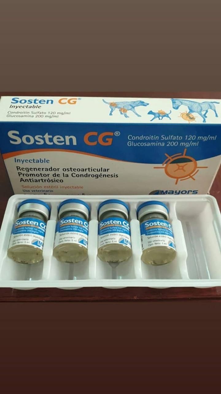Sosten CG are used together to treat the symptoms of osteoarthritis. As preventives of the wear and tear of cartilage structures and Osteoarticular regenerator, promoter of chondrogenesis and anti-arthrosic for horses, cats and dogs.